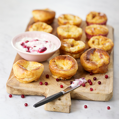 Dela dem på mitten eller skär i mindre snittar beroende på hur många ni är. Byt ut de traditionella pannkakorna till Pannkaksmuffinsar om ni vill göra något nytt – de är både roliga att göra och enkla att plocka fram. Scones och bärlyx mättar fint i magen och sedan är det alltid gott med apelsinjuice och färsk frukt som tillbehör.