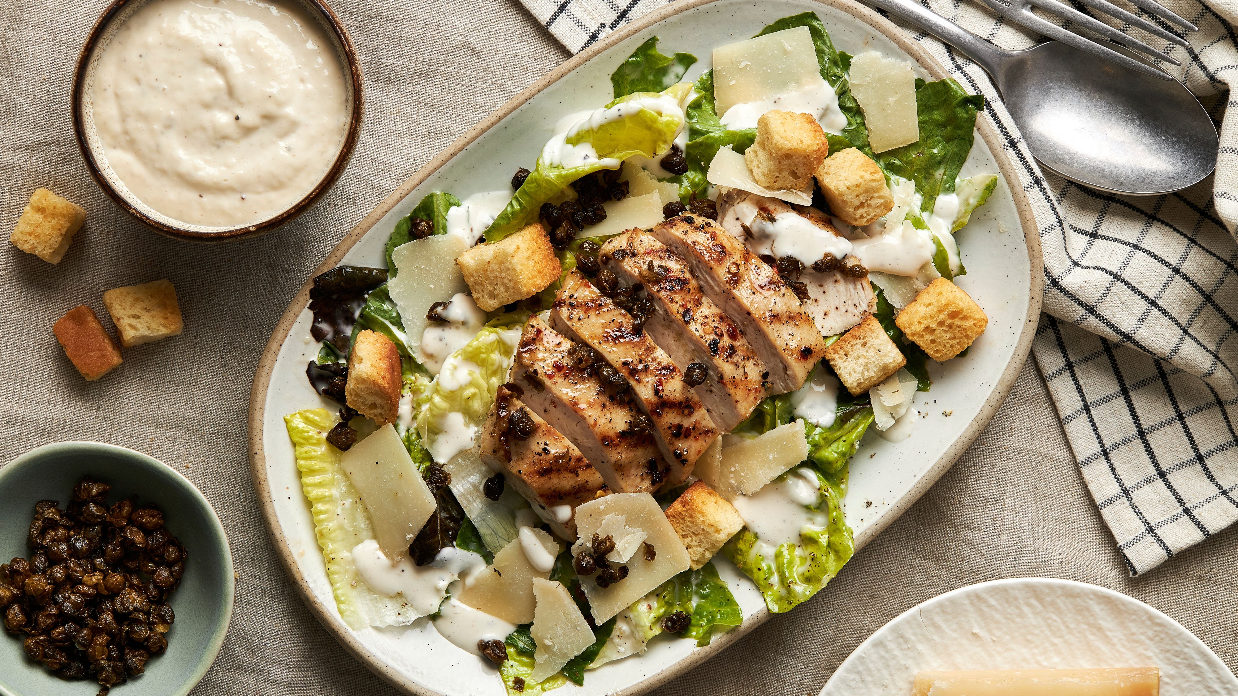 Nu till recepten. Först ut har vi en härlig caesardressing som gör sig väldigt fint till salladen. Här har du en dressing präglad av sälta och umami från parmesanosten. Servera med exempelvis grillad kyckling, romansallad, parmesan, krutonger och friterad kapris.